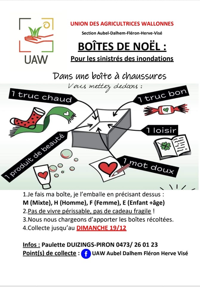 Le mardi 28 décembre, 300 Boîtes de Noël ont été chargées et amenées à Verviers, Spa, Theux et Pepinster. La distribution s’est faite en collaboration avec l’ASBL CSA (Chaines de Service et Amitiés), qui distribuait des sacs de vivres périssables et non périssables.